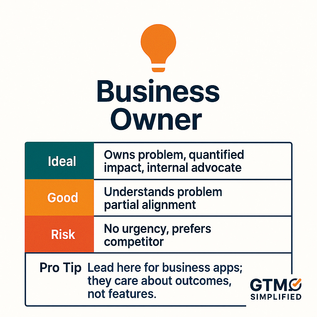 Pro Tip: Start here for business applications — they care about outcomes, not technical specs. If you are selling purely a tech solution, your business owner may reside in IT.