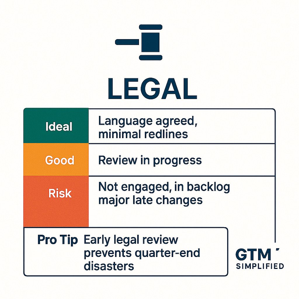 Risk (Red): Legal not engaged, stuck in backlog, or major late-stage changes.